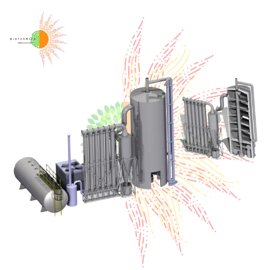 El proceso comienza con la descarga de los residuos en la tolva de alimentación, donde son triturados y deshidratados. Luego, ingresan al reactor de pirólisis, donde se descomponen térmicamente a 500 °C en ausencia de oxígeno, transformándose en biochar, bioaceites y syngas (gas sintético con alto poder energético).